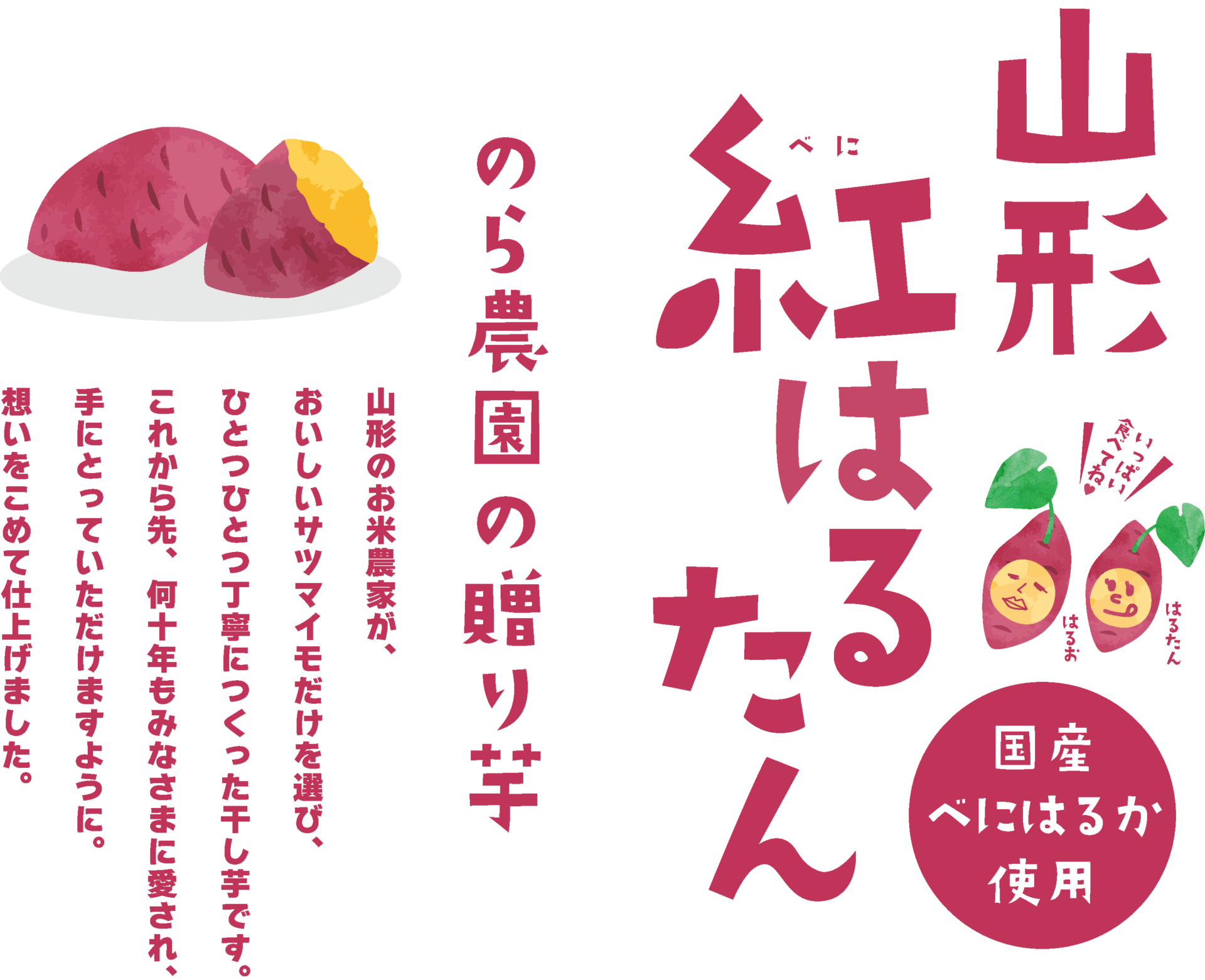 山形のお米農家が、国産べにはるかの中から選び抜いたおいしいサツマイモだけを使用し、ひとつひとつ丁寧につくりました。